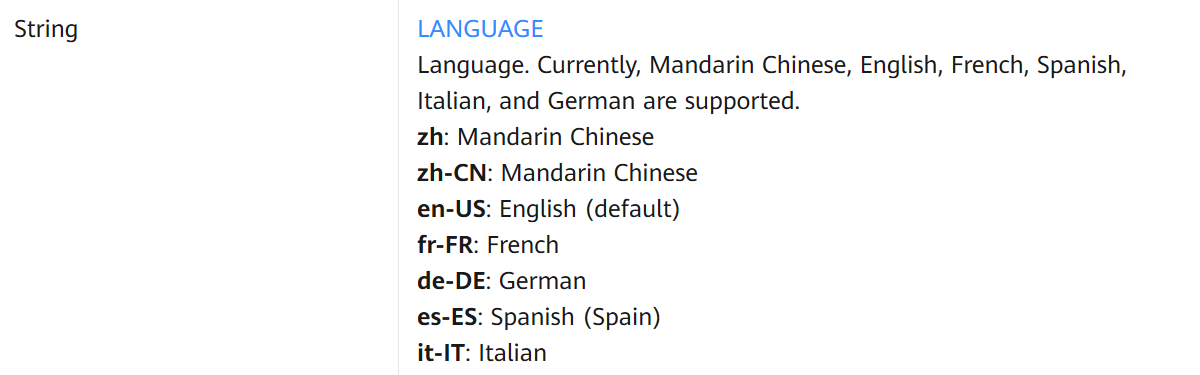 MLAsrRecognizer.createAsrRecognizer(context)to get created object from MLAsrRecognizer. As you would understand, MLAsrRecognizer is using Singleton design pattern to give you instantiated object. - Create an Intent that takes MLAsrCaptureActivity::class.java as the constructor parameter. Then put two extra key&value to use it. This part is common for both ASR usages. The first one is MLAsrConstants.LANGUAGE key which indicates the language. The values that can be used are in the following picture with bold styling.